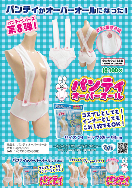 パンティは穿くから着る時代へ!日本製のオーバーオール型パンティ。お尻を包み込むフルバック仕様!サスペンダー付でウエスト周りのボタンで長さの調節が可能。メイド服や制服などのコスプレと組み合わせても可愛い!