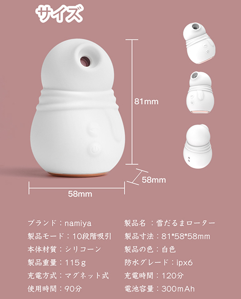 【愛の雪だるま】この冬を最も暖かくできるゆきちゃん、恋人や親友に送ってみませんか?癒されるキュートな見た目を裏切る10種類のズンズン吸引に悶絶しちゃおう。滑らかで素肌のようにスベスベとした、マシュマロやおモチのような触り心地♪初心者にとっても最高のイク調教神器に間違いなし!!【音速でクリ責め+乳首責め】敏感部分に直接触れることなく、超パワフルな振動と吸引が味わえる世界初の吸引バイブ!音波式モーターの高刺激周波数で、クリトリスをピンポイント攻撃。ボボボボっ!と力強い振動波によってブルブル揺さぶられ、まるでクリトリスをマッサージされているかのような未知の快感を得ることができます!!【安全素材+充電式】直接肌に触れるものだから、さらさらすべすべの高品質シリコン使用しています。そして、手にフィットする握りやすい形状と充電式リチウム電池を採用した軽量構造で疲れを感じることなくプレイに集中できる魅惑のアイテムが登場!【静音仕様+コンパクト】生活防水仕様となっているので、お風呂やプールなどの水場で楽しんだり、使った後は水洗いしてお手入れすることができます!また次も安心して楽しむことができるのも魅力です!●生活防水(IPX4)●10段階吸引●医療用シリコン素材、ABS●USBマグネット充電●充電時間:120分、稼働時間:90分●電池容量:300mah※こちらの商品は受注発注商品の為、ご注文から発送までに3、4営業日掛かる場合が御座います。