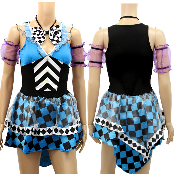 ふしぎの国でティーパーティー♪カラフルポップなマッドハッター風のコスプレ衣装。ブルーをベースに紫×黒とハーリキンチェック柄を随所にちりばめたオシャレでポップなミニドレス。ハーリキンチェック柄で軽やかなスカートをお探しの方にもぴったり♪ドレスは柔らかな素材を使用したノースリーブのワンピースタイプ!後ろ丈が長いハイロウタイプのスカートは、シースルーのオーガンジー生地を重ねたレイヤードデザイン。さらに、マッドハッターの特徴でもある「10/6」ミニハットと首リボン、シースルーのアームバンドもセット!絶妙な色使いで魅せる女性版マッドハッター風のハロウィンコスチュームです。スカート部分にもハーリキンチェック柄で拘りたい方や、流行り廃りの無いシンプルなデザインで楽しめるかわいいタイプのチェック柄に目がない方にもお勧めです♪。※セット内容以外は付属しておりません。