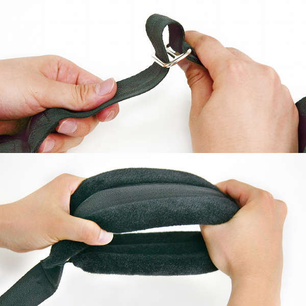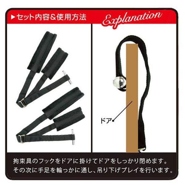 ドアの上部にフックを噛ませて腕と脚を固定!吊り下げ拘束が簡単にできるSMグッズ。初心者でも本格プレイが楽しめる、イーロックシリーズのドア腕・両足拘束具です。肌を痛めないようソフトな素材で作られ、体重の負荷を軽減させるため肉厚に仕立ててあり、縄で拘束するよりも負担が少ない簡易拘束具です。ドアの耐久性と吊り下げる人の体重を考慮して、安全にご使用ください。※設置場所の状態を確認してからご使用ください。
