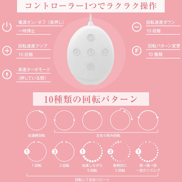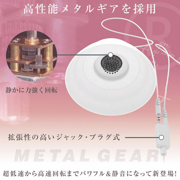 「金属ギア」搭載!静かに、ゆっくり、力強い回転が止まらない!大幅機能アップでもお値段そのまま!美しい流曲線のカップは乳房のサイズやかたちに関係なくやさしく吸着。カップ内部には静音設計の回転機構が組み込まれており、取り替え可能なマグネット式アタッチメントを自在に回転させます。上から服を着れば目立つこともなく屋外や公共のスペースでも楽しめる静音設計ですので、あらゆる場面でプレイが可能です。●10パターン回転●10段階の回転スピード