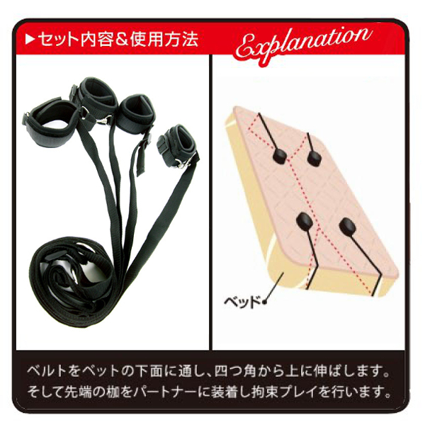 ベッド拘束プレイを自宅でも!あなたの欲望を叶えるSMグッズシリーズ「ELock」。ベルトをベッドの下に通して上下から出し、手枷と足枷をパートナーに装着したら完成!ベッドの脚に繋がなくても良いので、マットレスタイプでも使用可能です。枷はマジックテープ式でサイズ調節も楽々!肌に当たる部分はソフトなウレタン素材を使用し、お肌を痛める心配もありません。エロ絵師、尾髭丹氏の肉感的なパッケージにも注目です。※設置場所の状態を確認してからご使用ください。