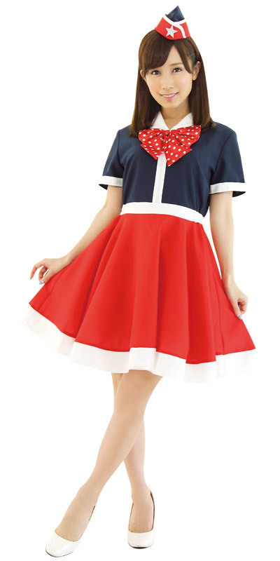 レトロながらもポップな雰囲気漂うキャビンアテンダント風コスチューム。●レッド×ネイビー×ホワイト●ライン入りワンピース(リボン付き)●星モチーフ付きのミニ帽子。CAには見えないほど、ハイカラなデザインに仕上げたオシャレで可愛いコスプレ衣装です。
