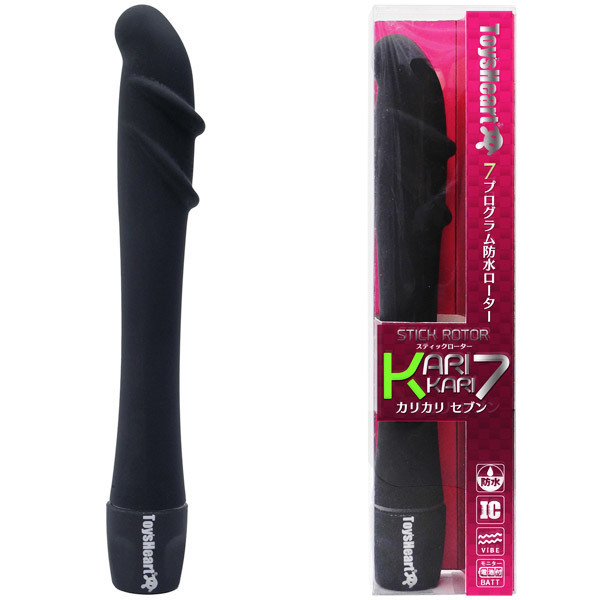 あの有名なアダルトグッズ社「トイズハート」から発売された、防水のスティック型ローター「カリカリセブン」。本体の挿入部・グリップ部に、マットコート素材を採用!長めのスリムボディには、7パターンの振動と連動するイルミネーションを搭載!先端がクイっと曲がっているので、Gスポットやその他の性感帯をピンポイントで刺激!また、背側の突起で内部をしっかり擦ることも可能なので、想像以上の高刺激が期待できます。シンプルな見た目なのに、強力振動を発揮する防水仕様のスティック型ローターです。単三電池×2本付属。
