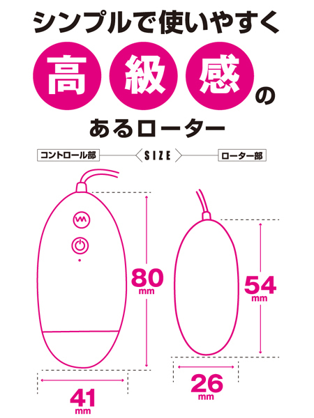仕様:パッケージ:16.5×9.0×5.0cm 本体:ローター5.4×2.6cm 重量:43g 電池:単四電池×2本使用