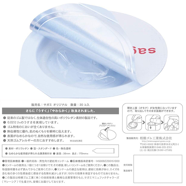 驚きのうすさ0.02ミリ!ゴムじゃないコンドーム「サガミオリジナル002」20個入り。人工心臓の部品や人工血管カテーテルなどにも使用されている、生体適合性の高い特殊ポリウレタン素材を採用したコンドーム。わずか0.02ミリのうすさながらゴム製コンドームよりも強度が高く、ゴム特有のニオイもないので天然ゴムアレルギーの方にも安心してお使い頂けます。熱伝導性に優れているので、肌のぬくもりが瞬時に伝わり「生」の挿入感を味わえます。開封しやすく、清潔で安全なブリスターパック入り。