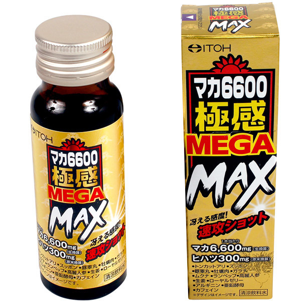 冴える感度!速攻ショット!?「マカ6600極感MEGA MAX 50ml」です。マカ6600mgとヒハツ300mgが入った製品。カフェインが入っているので敏感な方へのご利用はお避け下さい。