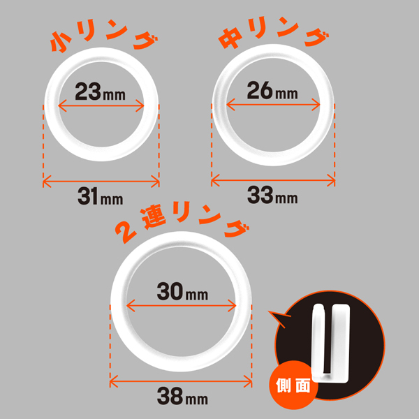 サラスベ質感でベタつき無し!伸縮性が高くて着けやすいソフトタイプのペニス用リング。皮戻りや持続力アップなどマルチに活躍!内径23mmの小、内径26mmの中、内径30mmの2連リングに加え、好きなサイズに調整できる内径調整リングの4個セットになっているので、個人の身体に合わせてお使いいただけます。素材は柔らかな高品質シリコンを採用◎