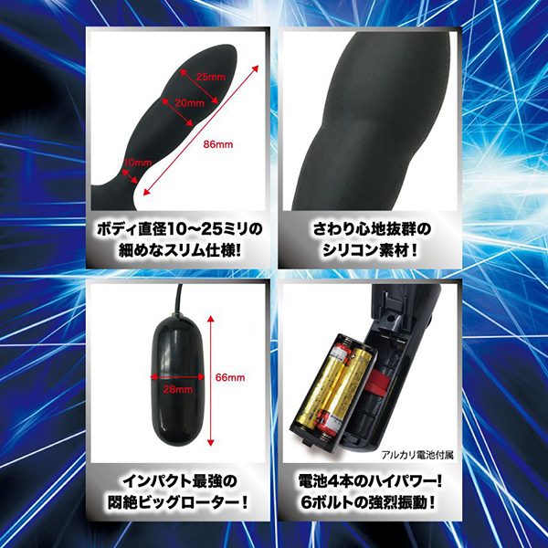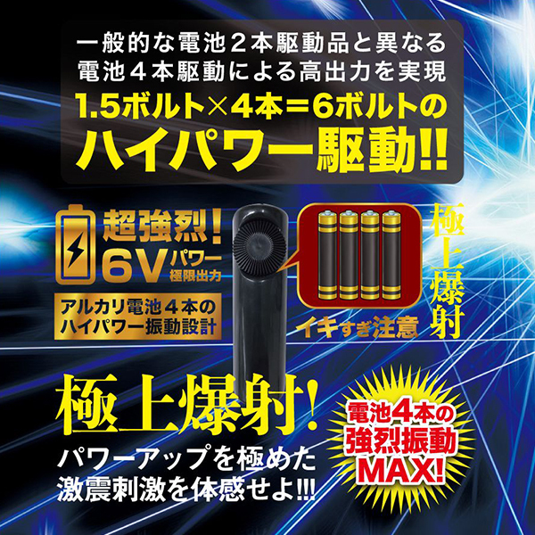 激震が走る快感!振動を極めた絶頂メンズローター!一般的なローターと異なる、電池四本駆動による6Vパワーの超強烈振動を実現させた「GEKISHIN 極」シリーズより、エネマボディを搭載したメンズローターが新登場!エネマボディは、さわり心地抜群のシリコン素材。ボディのラインは二箇所のくびれがアクセントを生みますカーブデザイン。超強烈振動がボディてっぺんまでビリビリ震える悶絶特殊構造です!「エネマスリム」はボディ直径10ミリ〜25ミリの細めなスリム仕様。この細さがアナタを虜にさせるはず!さらに、ハイパワーを加速させるアルカリ電池付き!パワーアップを極めた激震刺激を体感せよ!