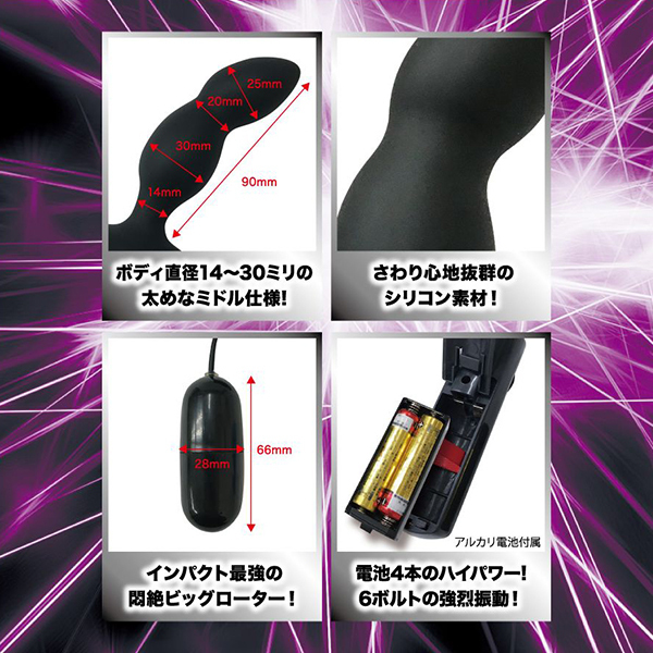 激震が走る快感!振動を極めた絶頂メンズローター!一般的なローターと異なる、電池四本駆動による6Vパワーの超強烈振動を実現させた「GEKISHIN 極」シリーズより、エネマボディを搭載したメンズローターが新登場!エネマボディは、さわり心地抜群のシリコン素材。ボディのラインは二箇所のくびれがアクセントを生みますカーブデザイン。超強烈振動がボディてっぺんまでビリビリ震える悶絶特殊構造です!「エネマミドル」はボディ直径14ミリ〜30ミリの太めなワイド仕様。この太さがアナタを満足させるはず!さらに、ハイパワーを加速させるアルカリ電池付き!パワーアップを極めた激震刺激を体感せよ!