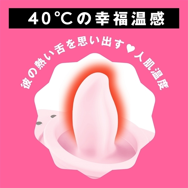 アツくて甘〜い愛のご奉仕クンニ_超!愛を感じる舐めローター!彼の熱い舌を思い出す温感機能は40℃まで温まる人肌温度_先っぽで刺激するチロチロクンニからグイグイ舐め上げる激しいクンニまで多彩なクンニが楽しめちゃう_さらに7パターンの振動機能付き!震えるあったかベロでとろける濃密前戯_やっぱりクンニがナンバー1!!!完全防水なので使用後のお手入れもラクチン♪敏感な部分に直接使うものだから、優しい肌あたりの高品質ソフトシリコンを使用しました。衛生的に保管できる蓋付きです。振動・舌舐め:7パターン&完全防水IPX7等級&充電用USBケーブル付属。カラー:ピンク