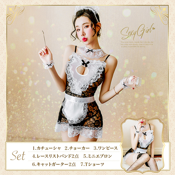 仕様:フリーサイズ セット内容:カチューシャ、チョーカー、ワンピース、レースリストバンド×2、ミニエプロン、キャットガーター、Tバックショーツ