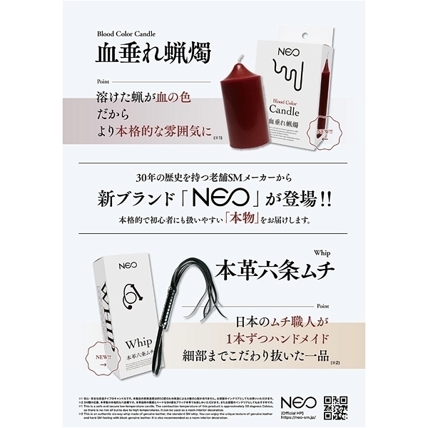 溶けた蝋が血の色なのでより本格的な雰囲気に低温で溶けるので跡がつきにくく、初心者の方にもおすすめです。直径が5cmもあるので持ちやすく垂らしやすい30年の歴史を持つ老舗SMメーカーから新ブランド「NEO」が登場!本格的で初心者にも扱いやすい「本物」をお届けします。
