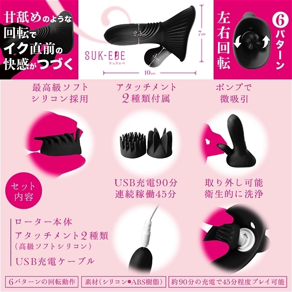 優しく舐めるから、イク直前の感覚がつづく。それが「ヤバ回転ローターNEBURINGUS−ネブリングス−」です。強い振動ばかりに慣れていると感度が鈍くなりませんか?今こそ優しくせつなく敏感な部分を「ねぶり」ましょう。敏感なアソコも胸もどちらもOK!!最初に使うときはお好みのアタッチメントを装着してからご使用ください。極限まで柔かくした高級シリコンブラシが優しく回転して刺激します。(薄めのローションをつけると滑りが良くなります)焦らされるような独特の感覚が、オーガズム直前のもどかしさを再現。左右回転6パターンで飽きさせません。優しさを演出するために敢えて「微」吸引ポンプも設置。ポンプのプッシュでもどかしい吸い付きが更なる焦らしを演出。しかも交換用アタッチメントつきで楽しさ2倍。【セット内容】ローター本体/アタッチメント(高級ソフトシリコン)/USB充電ケーブル。滑らかな感触をお求めの場合はローションをご利用ください。・6パターンの回転動作・約90分の充電で45分程度楽しめます●タイプB