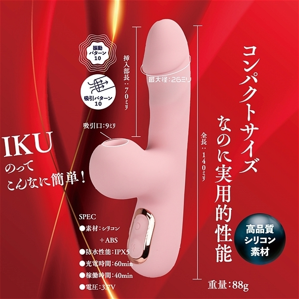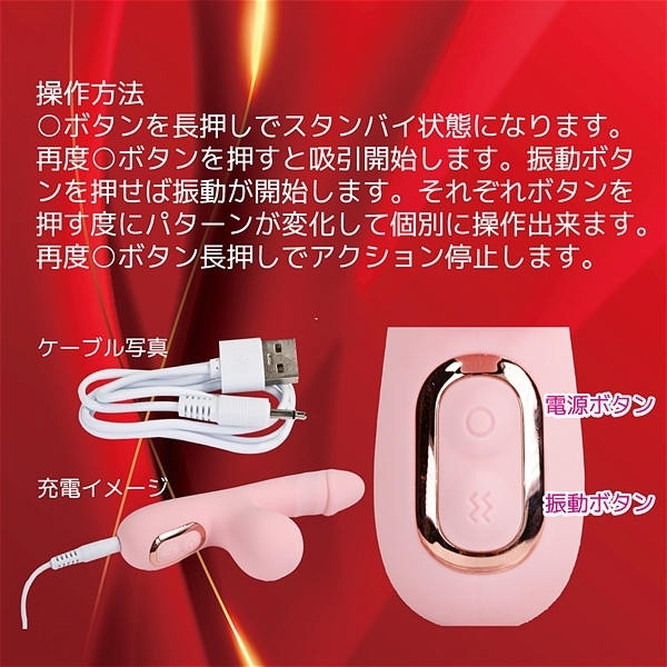 G責めと吸引外責めを楽しめる軽量・コンパクトなスティックアイテムです。Gには絶妙な振動を生み出す上質のモーター。何とも言えない快感の真空振動吸引機構を外責めに配置。滑らかで肌心地の良いシリコン素材にしっかり洗えるIPX5の防水性能。実用性の高い10パターン振動で自分に合わせて楽しめます。60分充電で最大40分の使用が可能(使用環境により大幅に増減します。)●HONEY ピンク
