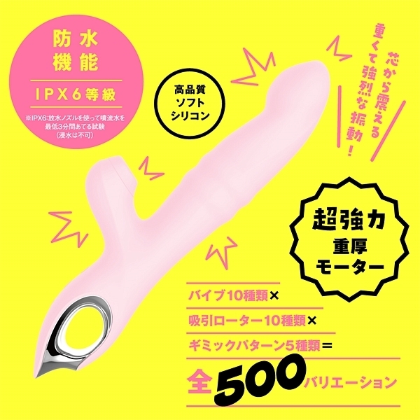 気持ちイイとこ全部責め♪究極ギミック搭載で奥イキ・中イキ・外イキ革命!ヘッドが前後に揺さぶり超ポルチ責めするスクラッチヘッドギミック!数珠形状のリングが上下にスライドし、感じるスポットを超擦り責めするスクラッチリングギミック!チュパチュパ吸引でクリイキ仕様の吸引ローター!バイブ振動10種類に吸引ローター10種類、ギミックパターンが5種類で脅威の全500バリエーションで楽しめます。超強力重厚モーター で芯から震える重くて強烈な振動!肌ざわりなめらかな高品質ソフトシリコン仕様です。本体は充電式なのでエコに使用可能。本体:充電時間約100分※本体:最大連続稼働時間約50分(初期振動パターン未変更時)_IPX6等級_バイブ・ローター各10パターン振動_ギミック5パターン可動_付属品:USBマグネット式充電ケーブル※IPX6:放水ノズルを使って噴流水を最低3分間あてる試験(浸水は不可となります)●カラー:ピンク