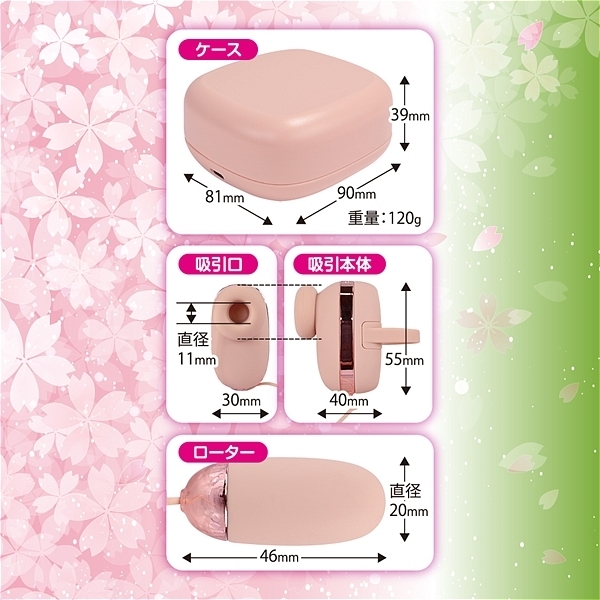 仕様:パッケージ:10.7×101×5.5cm 本体:ケース(9.0×8.1×3.9cm)、吸引(5.5×4.0×3.0cm・吸引口直径1.1cm)、ローター(4.6×2.0cm) 重量:120g