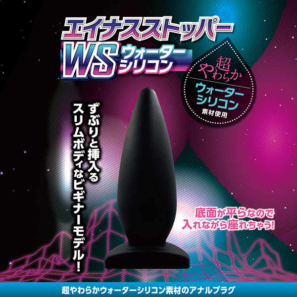 あのエイナスストッパーからウォーターシリコン素材を採用した新モデルが登場しました!こちらの「エイナスストッパー WSウォーターシリコン (02)」は先端部分が細めで根本付近が太くなるというスタンダードフォルムのアナルプラグです♪やや硬質なので抵抗感のあるタイプが好みの方には少し不向きといえます。サイズ的には最大径が3.8cmとビギナークラスで、太さ2.5〜3.8センチが守備範囲の方にはぴったりです♪美しいボディラインやエイナスストッパーの魅力をそのままに、しっとりきめ細やかで生々しい生体的な肉感と弾力を実現。人体や環境にも優しい安心材料で挿入感を高める流線的なフォルムが気持ちいい♪握るとむにゅっと潰れる感じなのでこれからサイズアップを狙っている方にも最適!握りながら挿入し、ナカで徐々に広がっていく感じはやみつきになりそうです♪アナルの慣らし用としても、パートナーのアナル調教用としても絶妙なスリムボディは大活躍!アナルの手ほどきにもぴったりな快感が特徴で、アナルビギナーには特におすすめの逸品です。